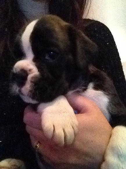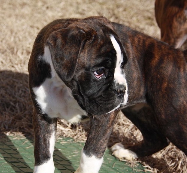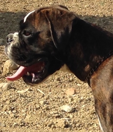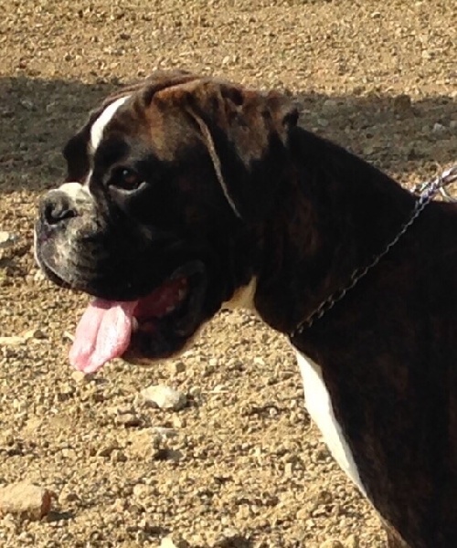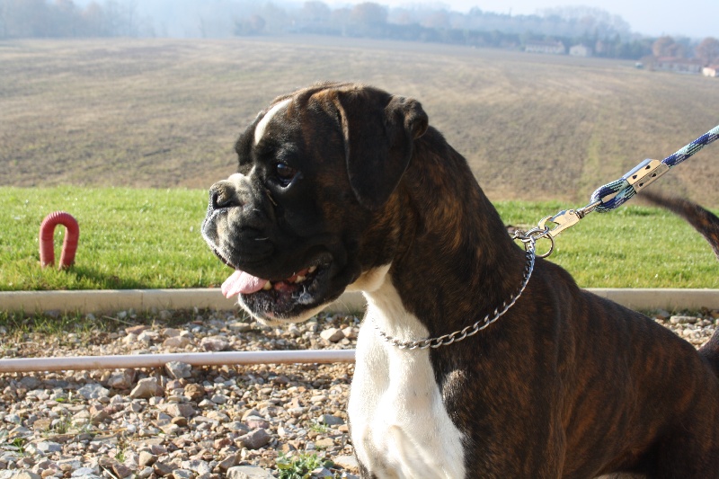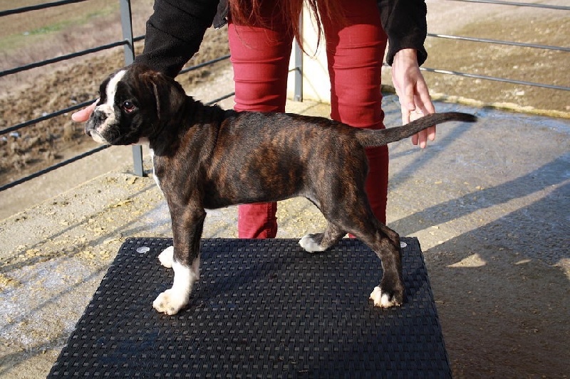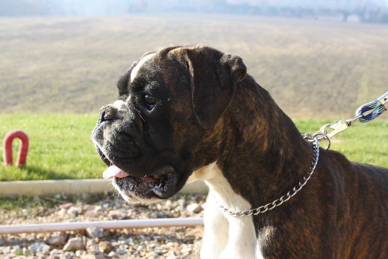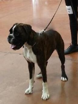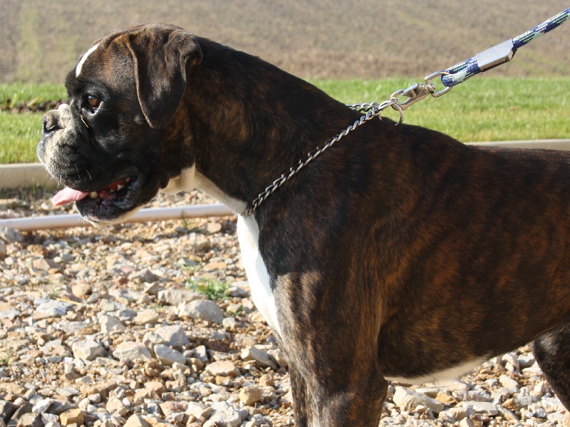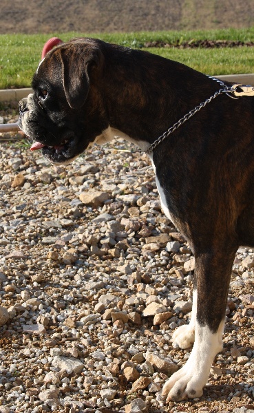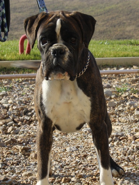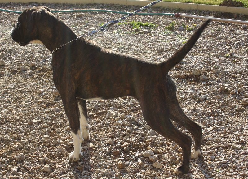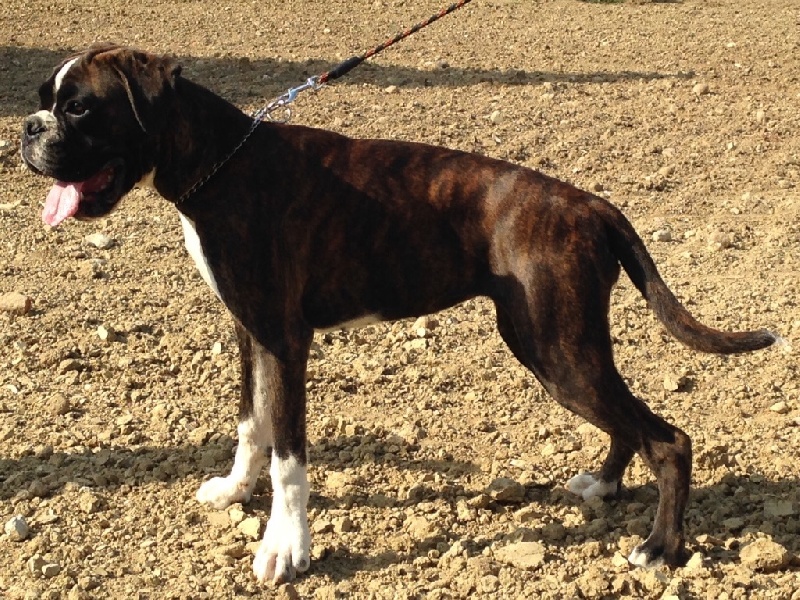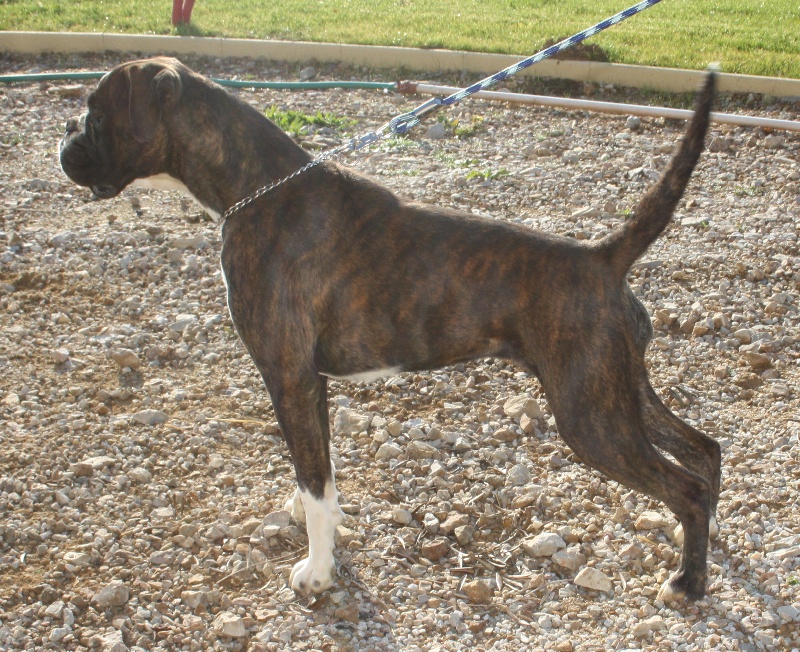 Belle robe bringée cuivrée et blc ,bonne angulation devant,trés angulé derrière,forte ossature,belle poitrine,exc dessus,bonne encolure,superbe tete,crane bien ciselé,oreilles bien placée,belle oeil,museau bien cubique,exc prognatisme, menton bien marqué, se déplace bien