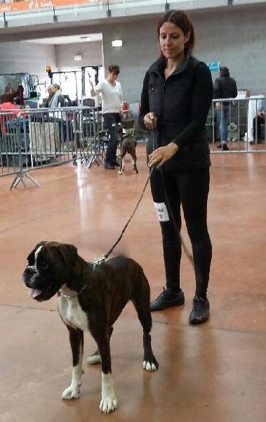 Superbe chienne,puissante et feminine, carrée, montante, belle poitrine et poitrail,exc dessus,belle encolure, superbe tete, museau moins cubique en harmonie avec un crane bien ciselé, exc stop, oeil foncé, exc machoire et prognatisme